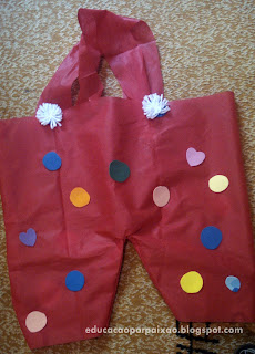 dobra-se ao meio e cole a lateral , dobra-se outra vez e faça um corte na perta em formato de um cone para formar a calça do palhaço passe a cola quente.